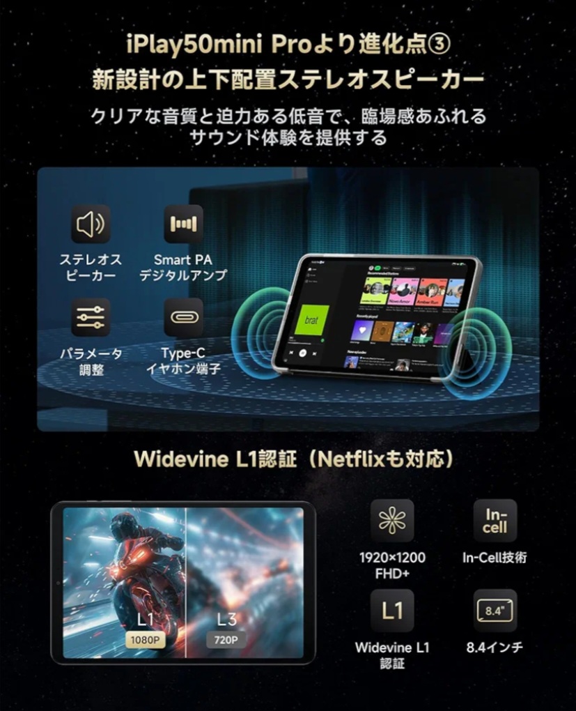 1920×1200のフルHD解像度で、鮮明で美しい映像を楽しめます。8インチサイズは持ち運びやすく、外出先でも快適に使用可能。