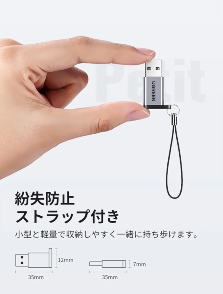 耐久性と安心の設計 UGREENならではの高品質な素材で、耐久性抜群。日常的に使っても安心して長く使えます。紛失防止ストラップ付き 小型のアダプタですが、ストラップが付いているため失くす心配が少ないのが嬉しいポイント。