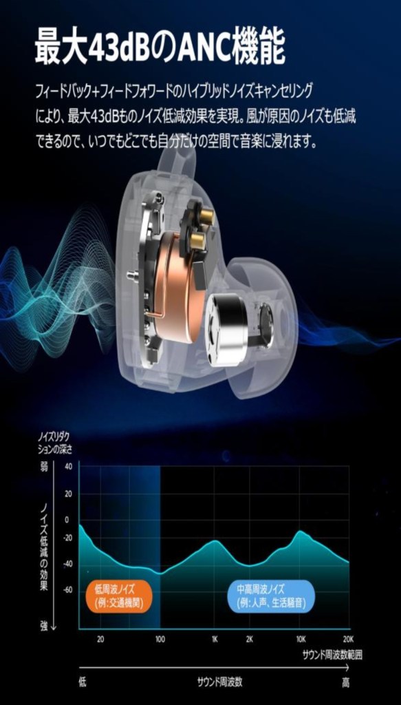 最大 -43dB のノイズを低減できるため、電車やカフェなどの騒がしい環境でも音楽に没入できます。
