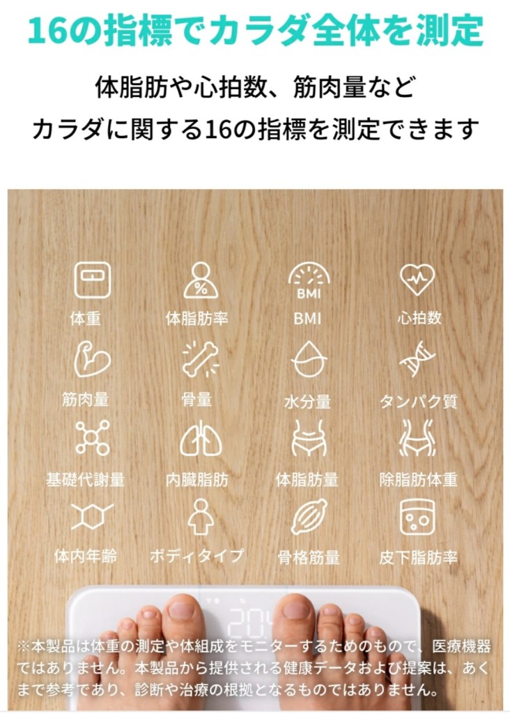 - 体重、体脂肪率、BMI、心拍数、筋肉量、基礎代謝量、水分量、体脂肪量、骨量、内臓脂肪、タンパク質、皮下脂肪、除脂肪体重、ボディタイプなどを測定可能。