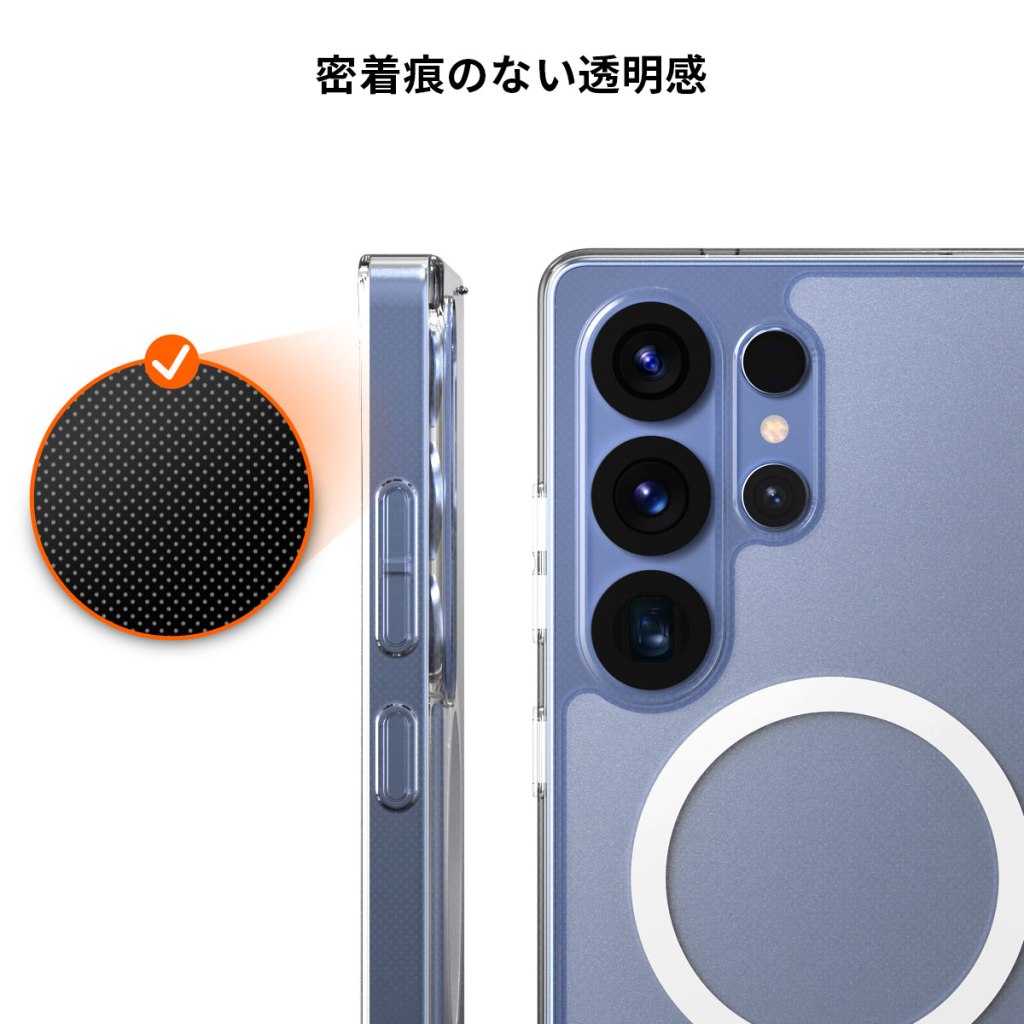 また、透明ケースの大敵である”密着痕”を防ぐため、背面内側にはドットテクスチャー処理が施されています。これにより、ケースの透明感が長期間維持されるのもポイントです。
