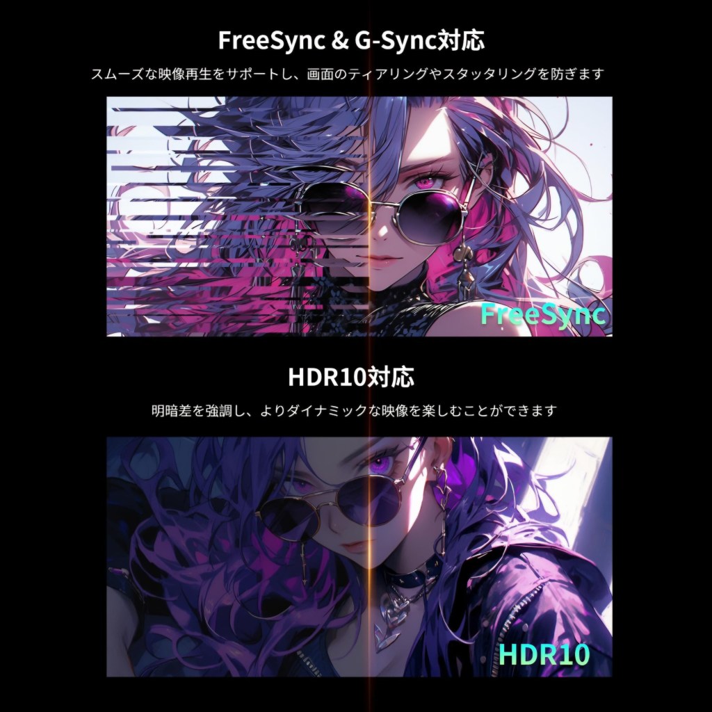 AMD FreeSync & NVIDIA G-Syncに対応し、ティアリング(画面のズレ)やスタッタリング(カクつき)を抑え、より快適なゲーム体験を提供します。