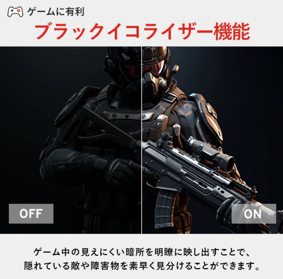長時間のゲームプレイでも目に優しいブルーライト軽減機能を搭載。また、非光沢パネルなので、余計な映り込みがなく、集中してゲームに没入できます。