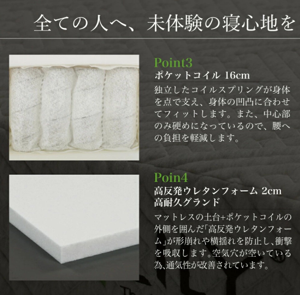 このマットレスはポケットコイル×高反発ウレタンの四層構造を採用し、理想的な寝姿勢をサポートしてくれます。厚さ24cmのしっかりとしたつくりで、体圧分散に優れ、寝返りもスムーズ!