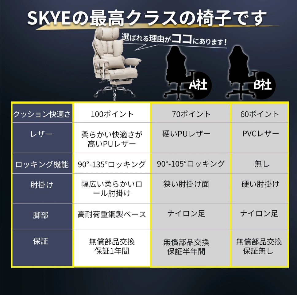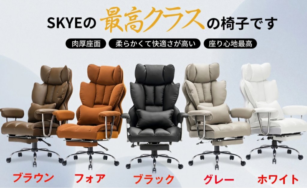🔍 #SKYE #ゲーミングチェア #デスクチェア #オフィスチェア #社長椅子 #テレワーク #長時間快適 #リクライニング #オットマン付き #疲れにくい椅子 #ゲーマー必見