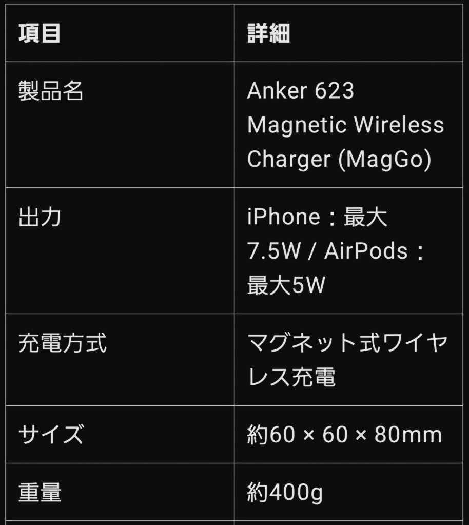Anker 623 Magnetic Wireless Charger (MagGo) は、MagSafe対応のマグネット式ワイヤレス充電器 で、
