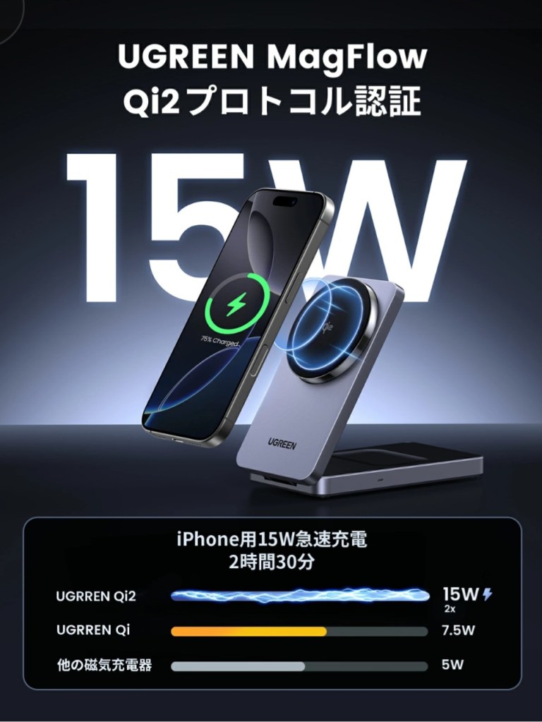 「UGREEN MagFlow ワイヤレス充電器」 は、Qi2対応のMagSafe充電スタンドです。