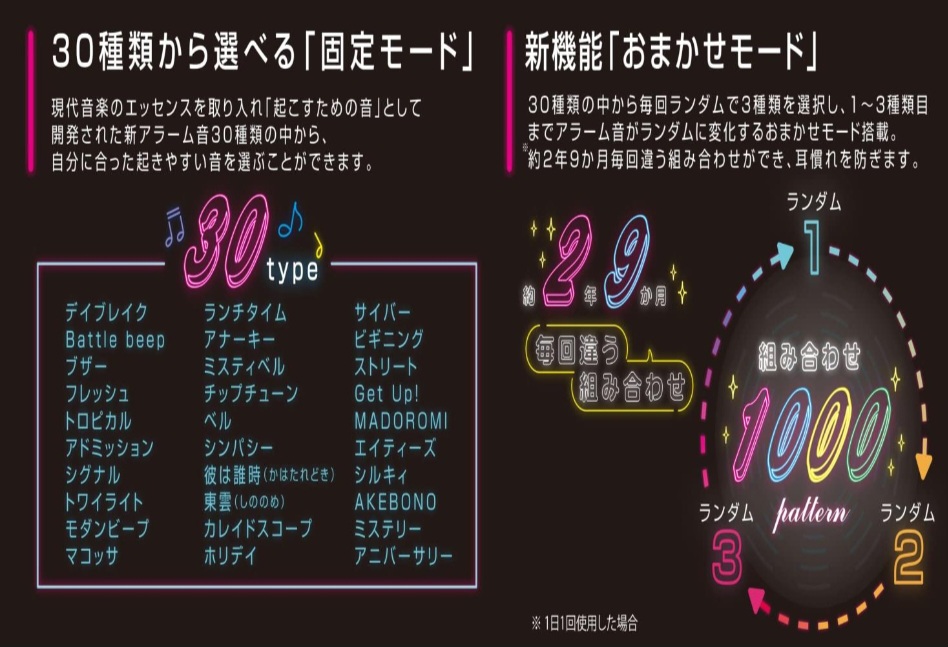 アラーム音が毎回変わるから、「聞き慣れてしまって起きられない…」ということがありません。