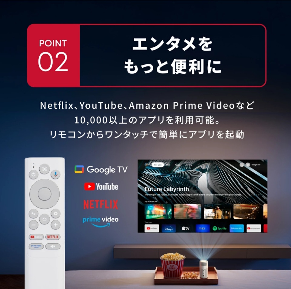 このプロジェクターはGoogle TVを搭載しているので、スマホやPCを接続しなくても、単体で動画視聴が可能!