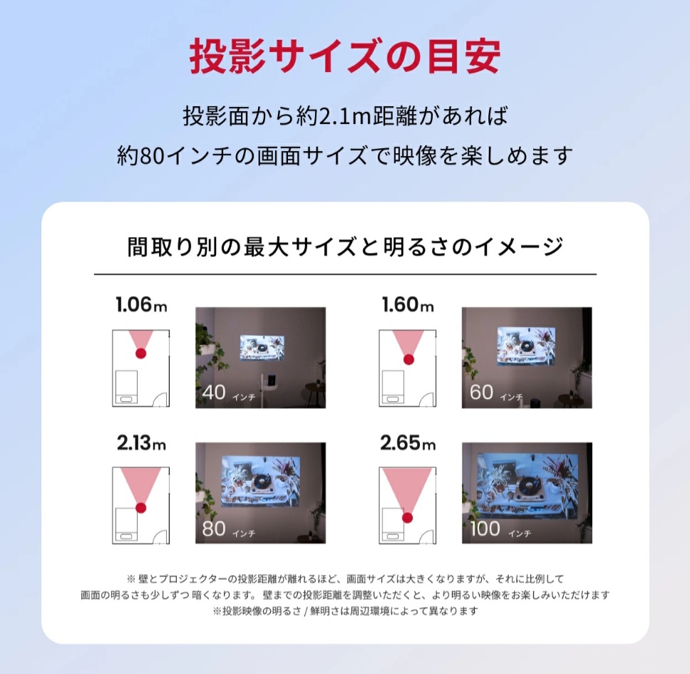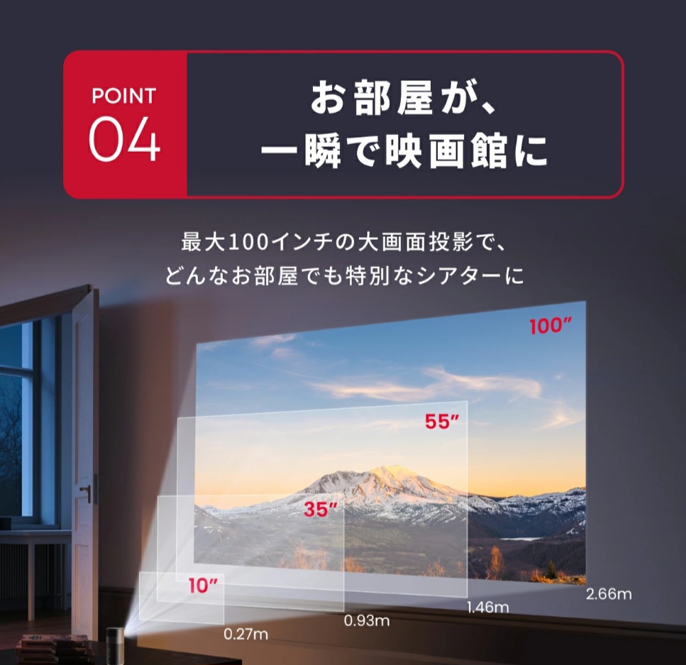 🎥 2. 最大100インチの大画面&720P HD対応!