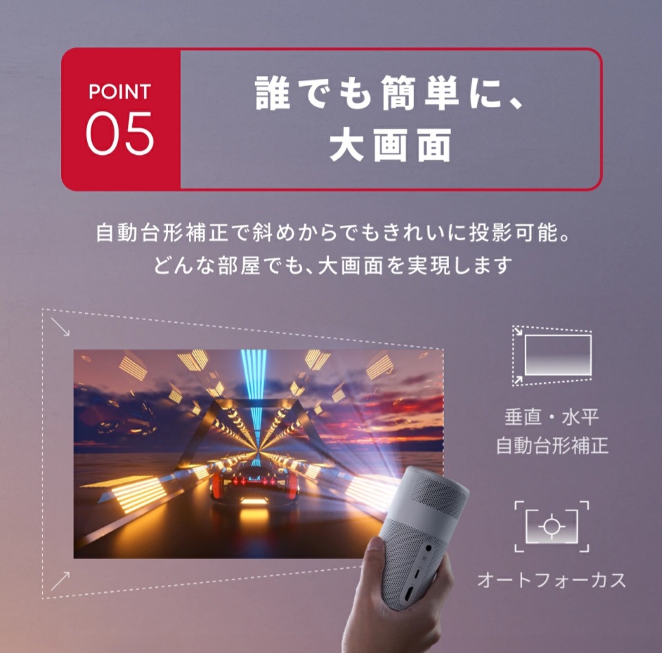 🔄 自動台形補正でどこに置いてもキレイに投影!