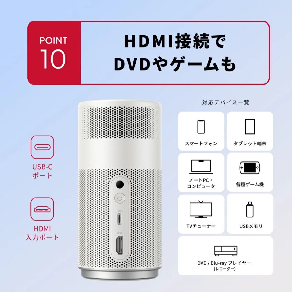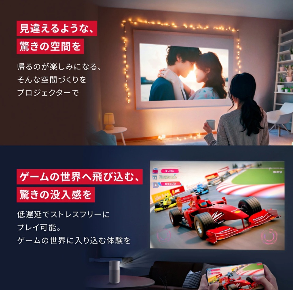 超小型ながら、家庭用・アウトドア・天井投影まで幅広く使える優れもの。