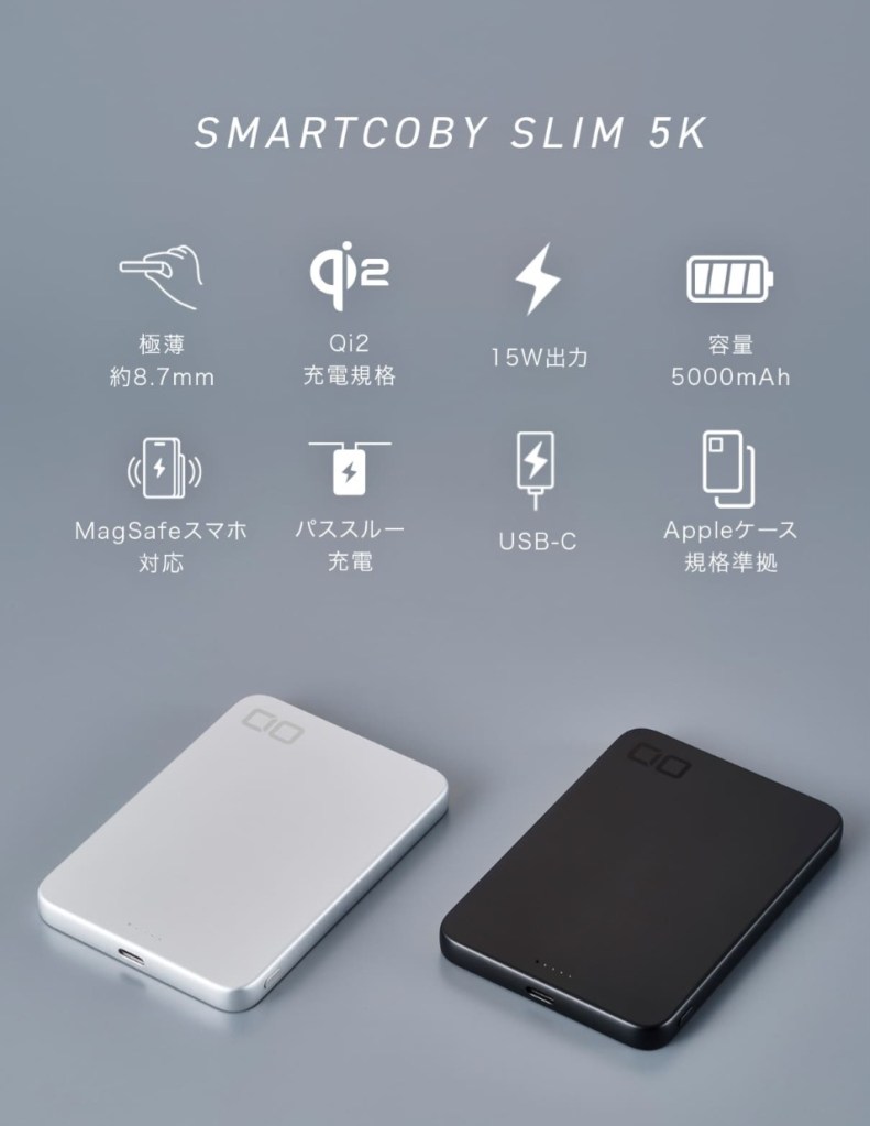 CIO SMARTCOBY SLIM 5K | モバイルバッテリー 5000mAh ワイヤレス充電 Qi2対応 MagSafe対応スマホ対応 [薄さ8.7mm] 軽量 小型 薄型 USB-C 15W 価格:5980円 |