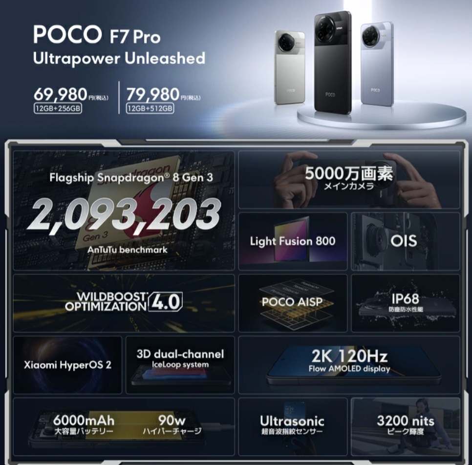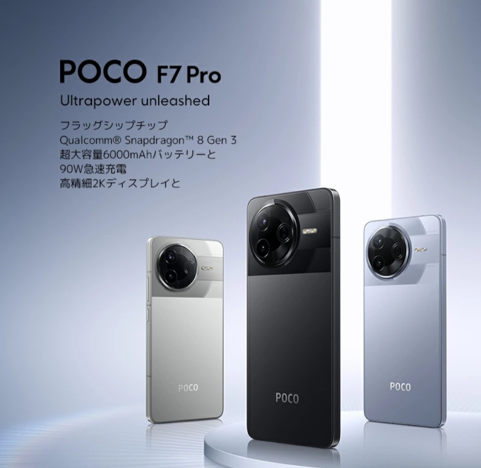 POCO F7 Pro が登場!✨ Snapdragon 8 Gen 3 搭載でパワフルな処理性能を誇りつつ、6000mAhの超大容量バッテリー と 90W急速充電 を備えたタフなスマートフォン。さらにIP68防水防塵対応 で、過酷な環境でも安心して使えるモデルです。