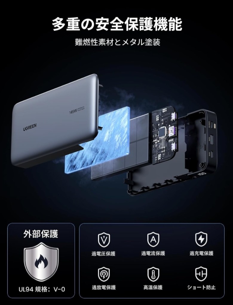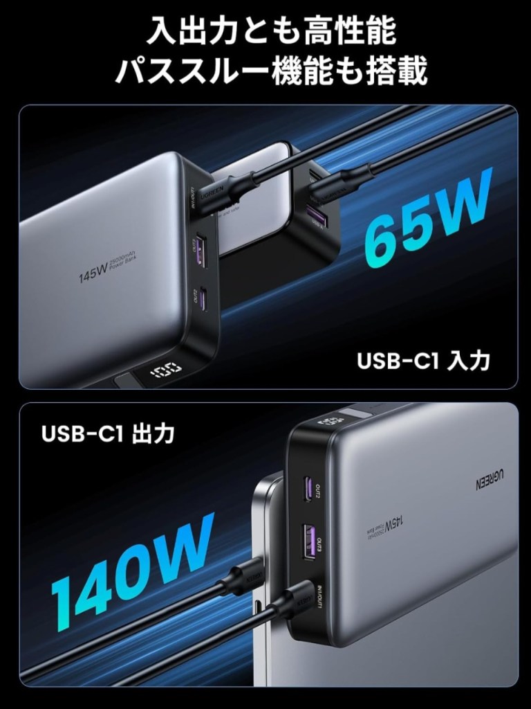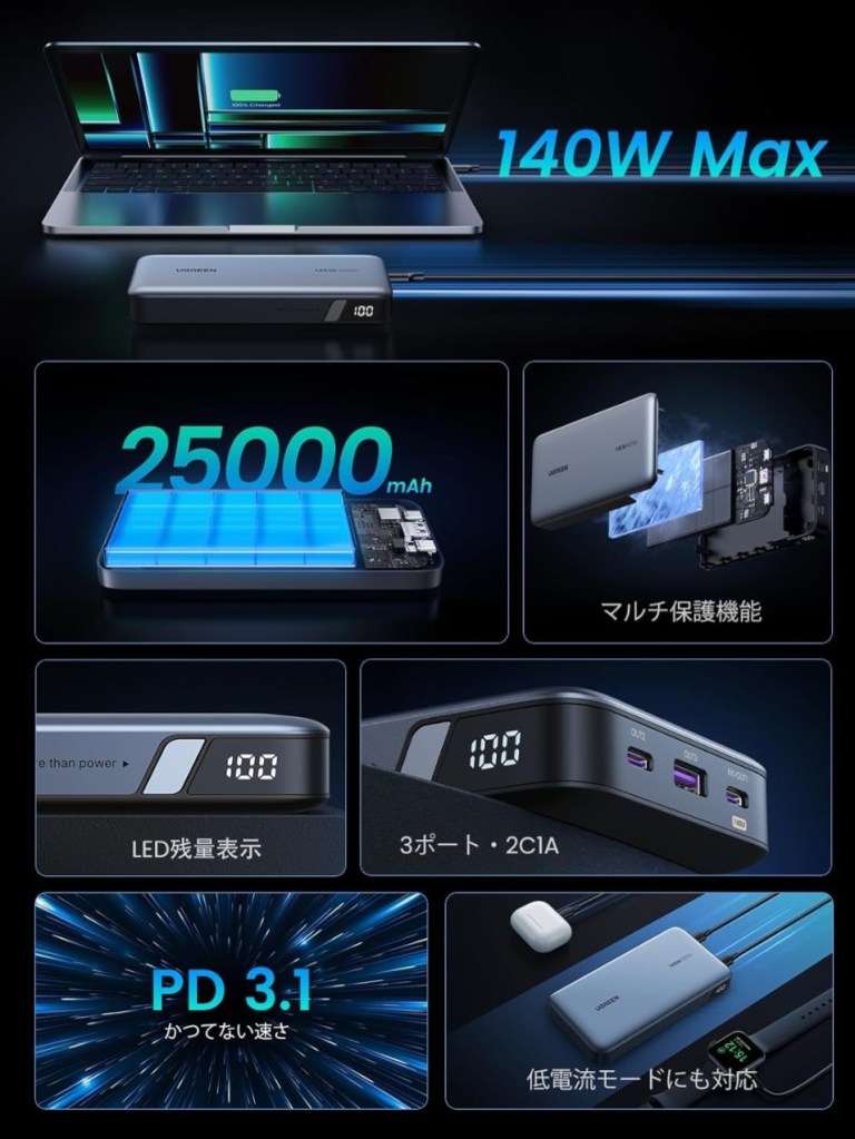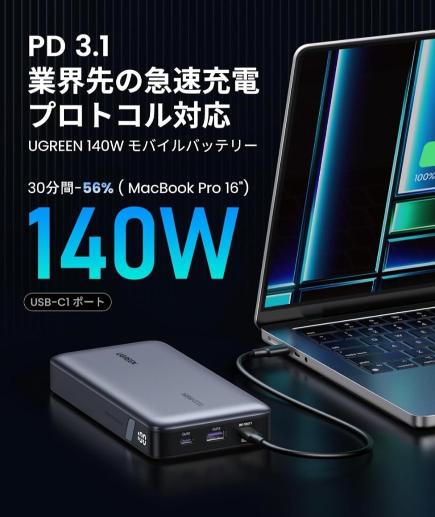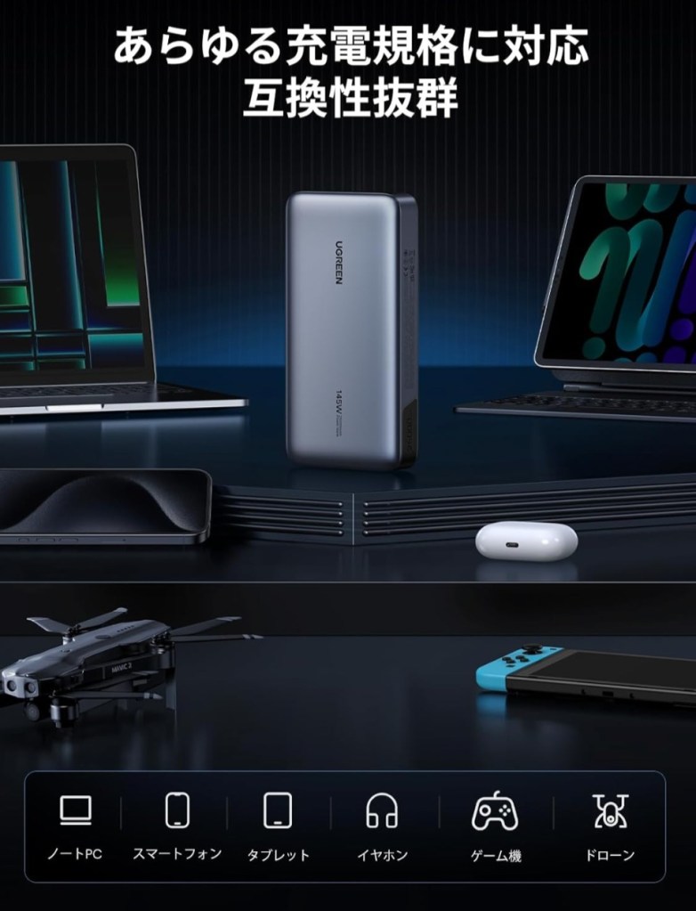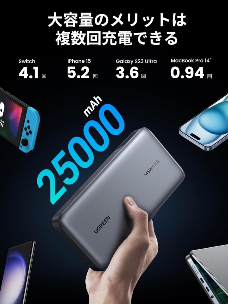 「UGREEN PD3.1 モバイルバッテリー」は、25000mAhの大容量と最大145Wの高出力を誇る、ハイパワーなモバイルバッテリーです!