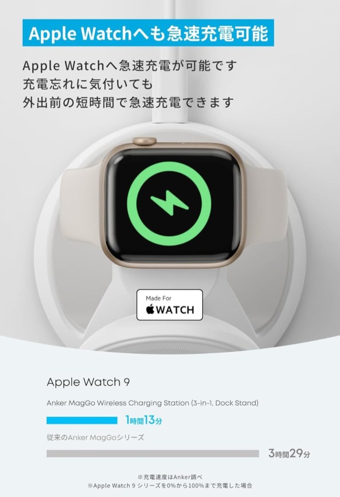 - Apple公式MFi認証取得済で、Apple Watchの充電も安心
