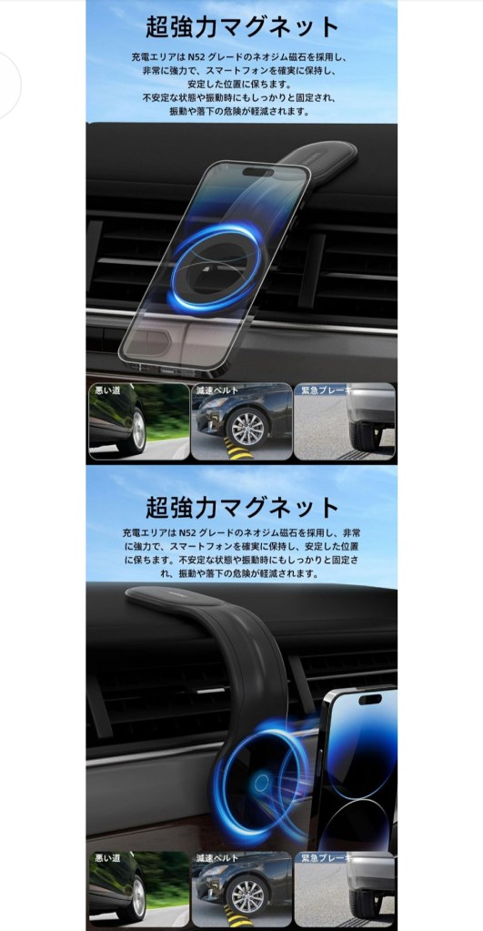 磁力が強めで、凸凹道や急ブレーキでもしっかり固定されてます。スマホが落ちる心配がないのは安心感があります。