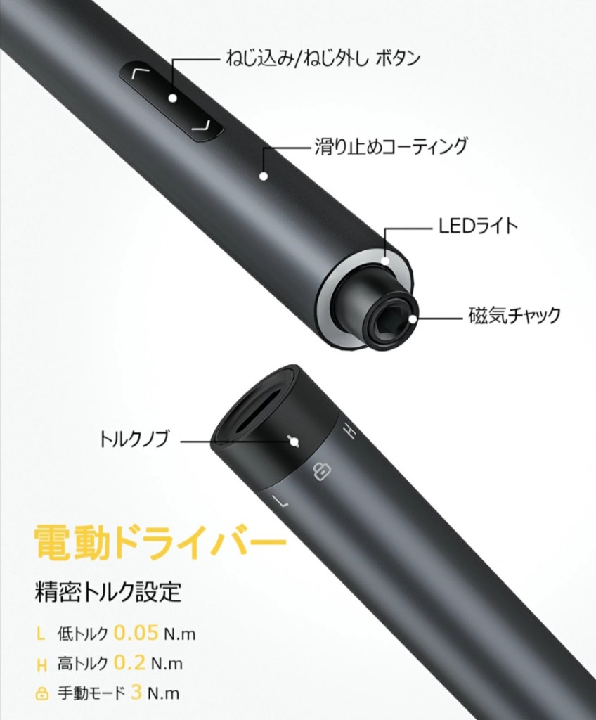 | ドライバー | アルミ製の高級感ある筐体/LEDライト内蔵 |