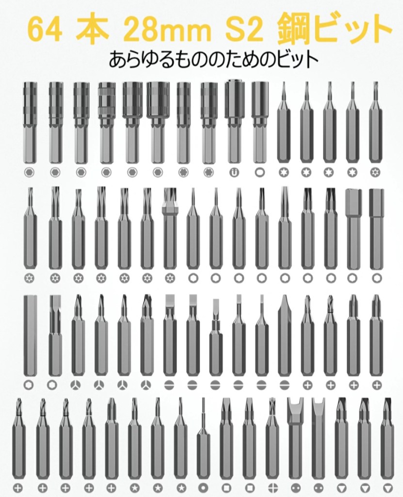 | ビット数 | 64本(星形・トルクス・Y字・六角・フラット・プラスなど多種対応) |