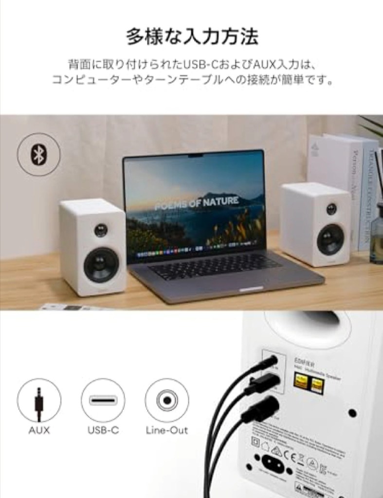 - 入力端子:USB-C、AUX(3.5mm)