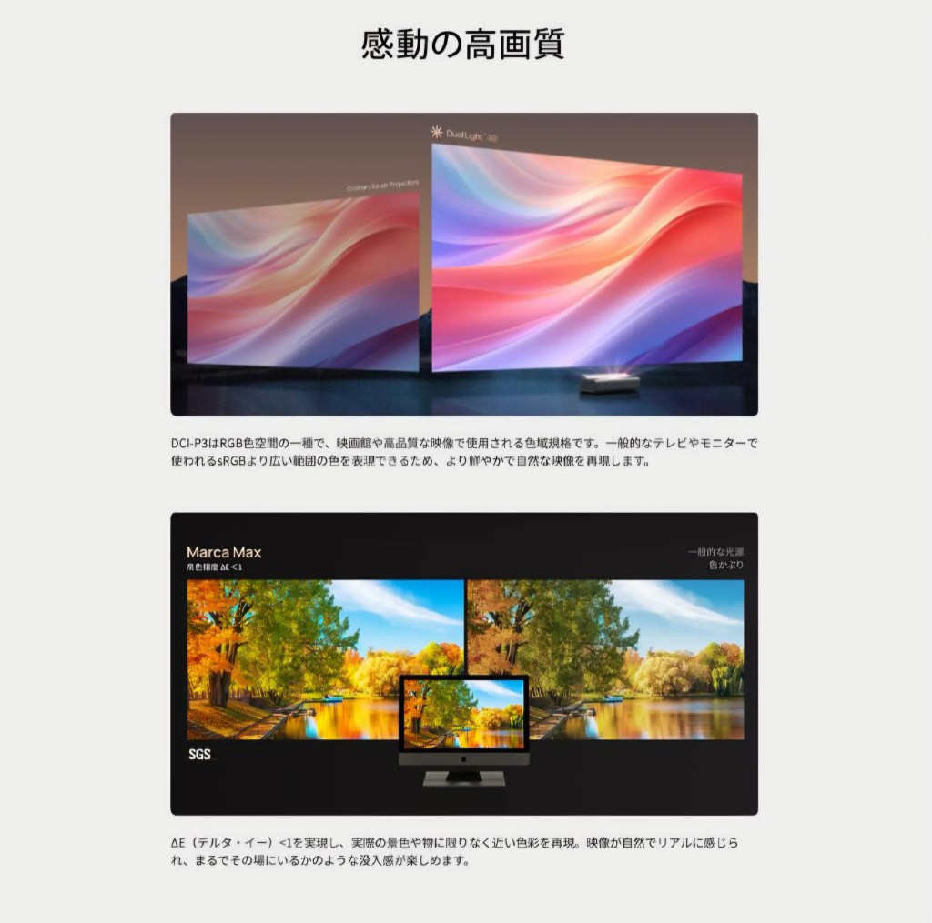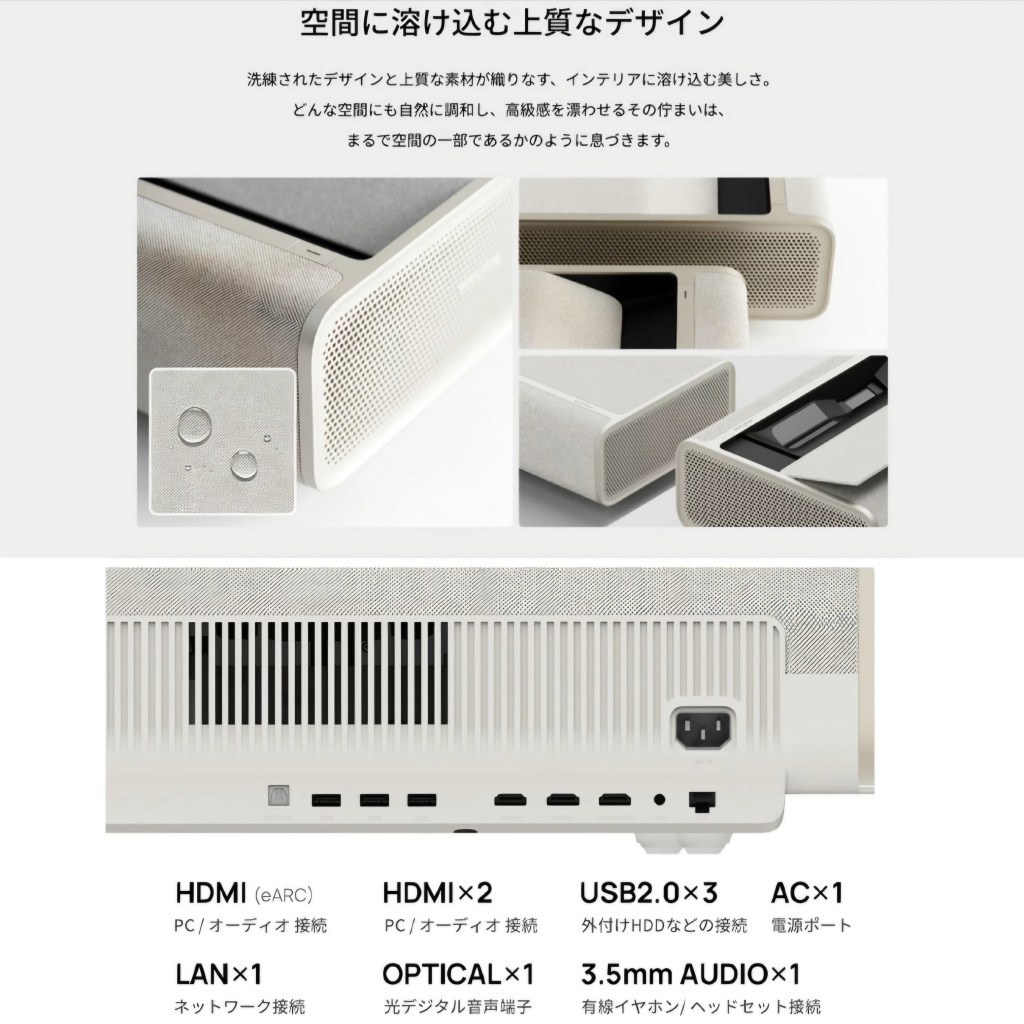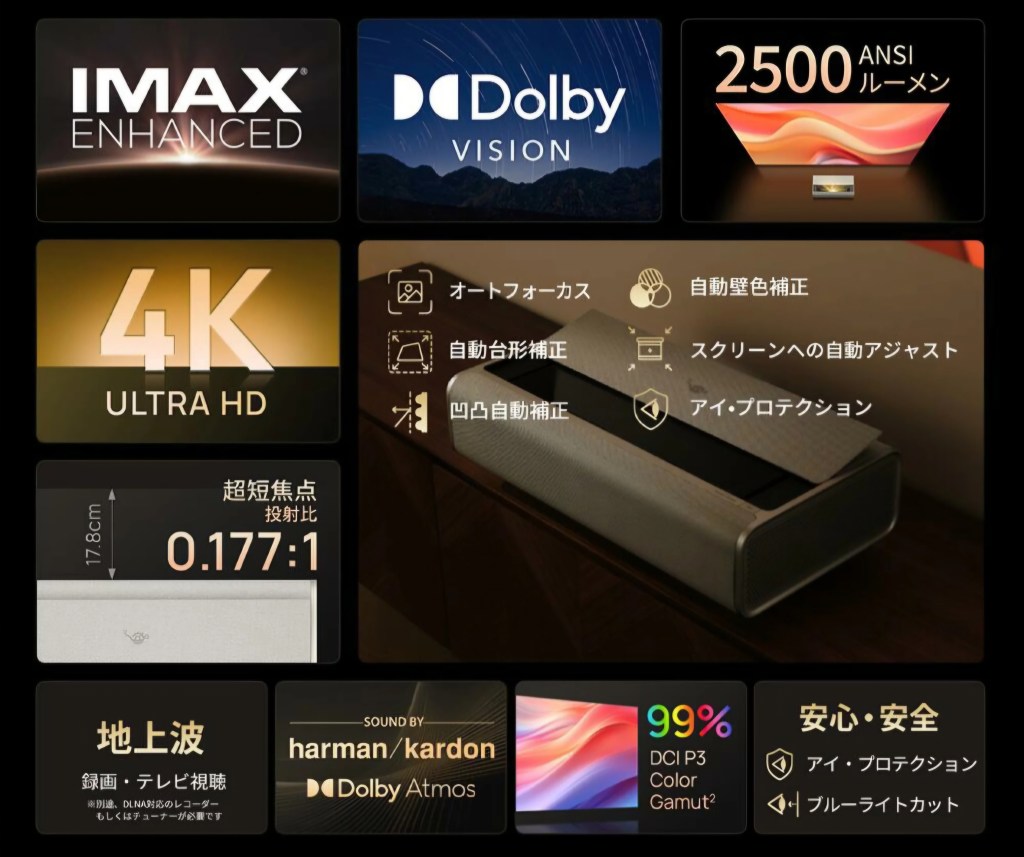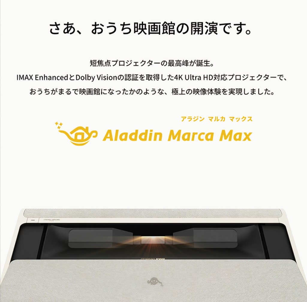 Aladdin Marca Maxã¯ãå£ããããã17.8cmã®è·é¢ã§100ã€ã³ãã®4Kæ åãæåœ±ã§ããè¶ ççŠç¹ãããžã§ã¯ã¿ãŒã§ããIMAX EnhancedãšDolby Visionã®èªèšŒãååŸãã2500ANSIã«ãŒã¡ã³ã®æããã§æ¥äžã§ãé®®æãªæ åãæ¥œãããŸããHarman Kardon補ã®80Wã¹ããŒã«ãŒãæèŒããDolby AudioãšDTS:Xã«å¯Ÿå¿ããèšå ŽæããµãããµãŠã³ããé åã§ãã