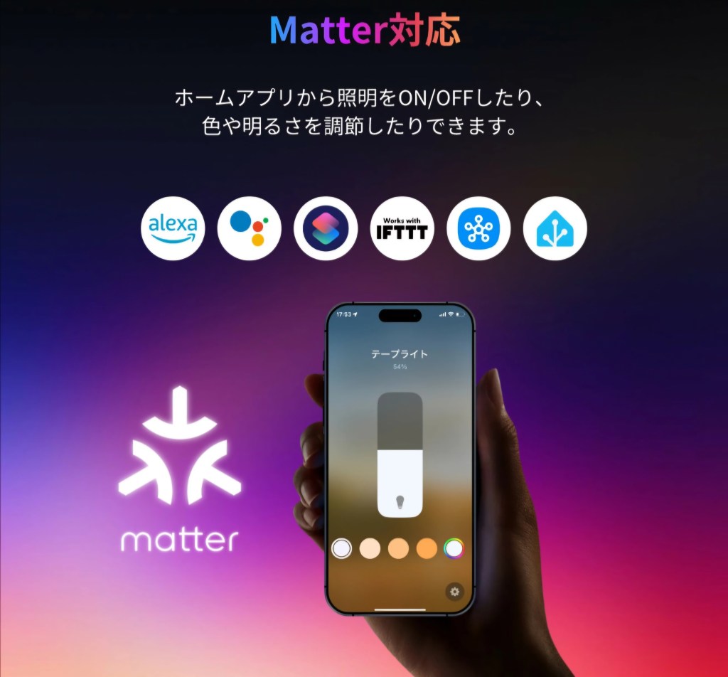 このLEDテープライト、スマホや音声操作に対応したスマート照明なんです。