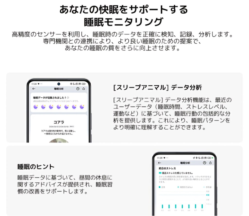 心拍数や血中酸素濃度、睡眠の質、ストレスレベルなどを24時間モニタリングし、健康管理をサポートします。