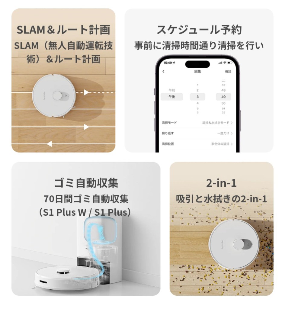 | S1/S1 Plus W | 2,700Pa | ◎(電動制御) | ◎(Plusのみ) | ◎(静音モード) | 高精度LiDAR(SLAM) |
