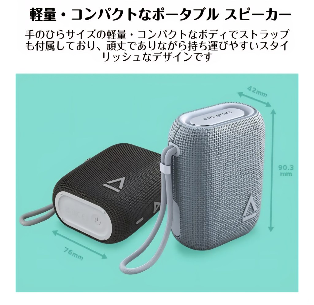 Creative MUVO Flexは、**約198gの軽量設計**、**IP67の防水防塵対応**、**約10時間連続再生**、**10 Wの音圧**と、ポータブルスピーカーの必須要素をしっかり満たしています。