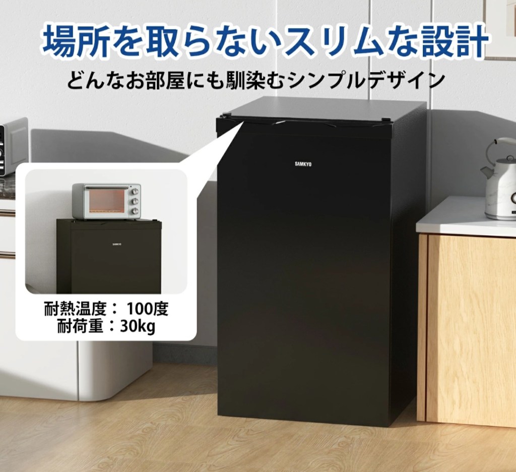 特に一人暮らしの方や、キッチンが狭い方におすすめ。冷凍庫の上に電子レンジや小物を置ける耐熱天板も便利です。