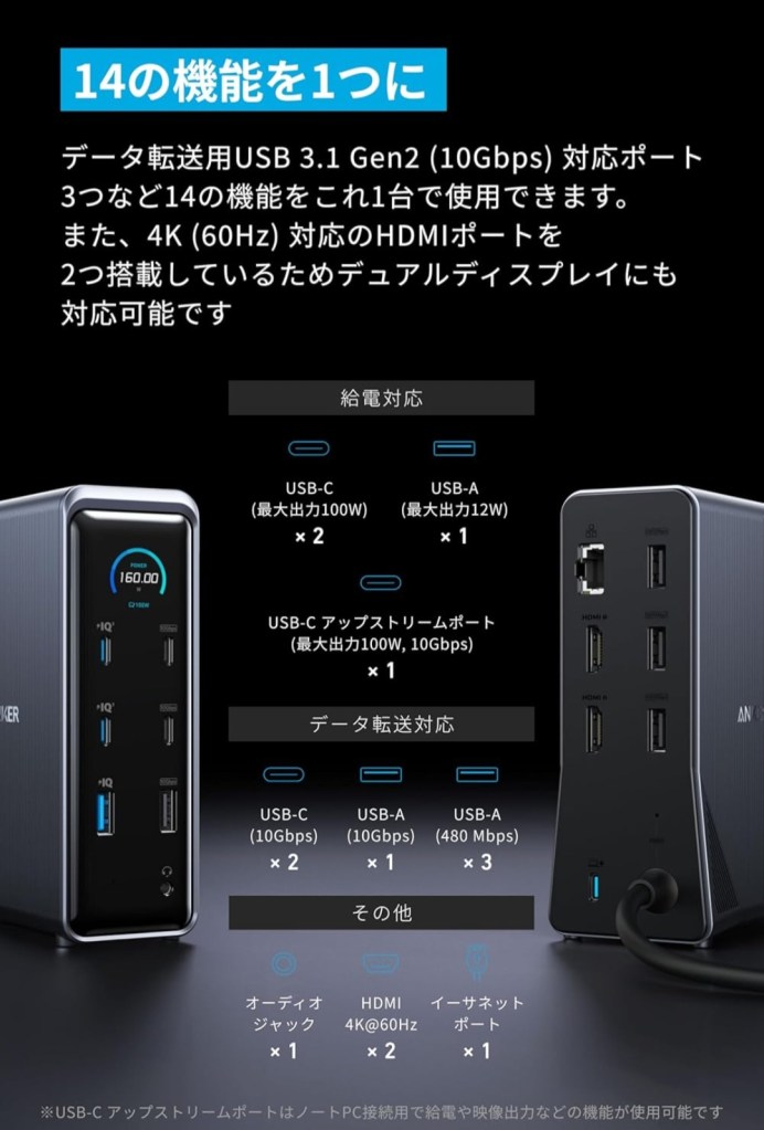 - 🔌 USB-Cアップストリームポート:最大100W出力(ノートPC充電対応)
