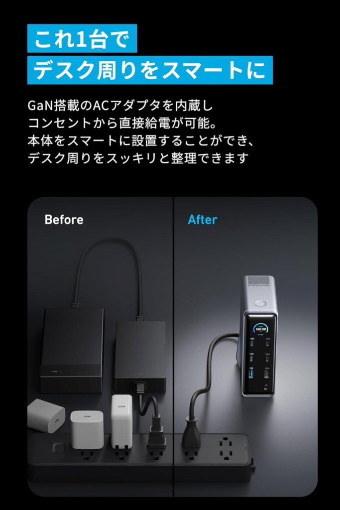 GaN搭載でコンパクトながらも、USB PD最大100W出力、デュアルディスプレイ対応、最大14ポートという圧倒的な拡張性を誇ります。