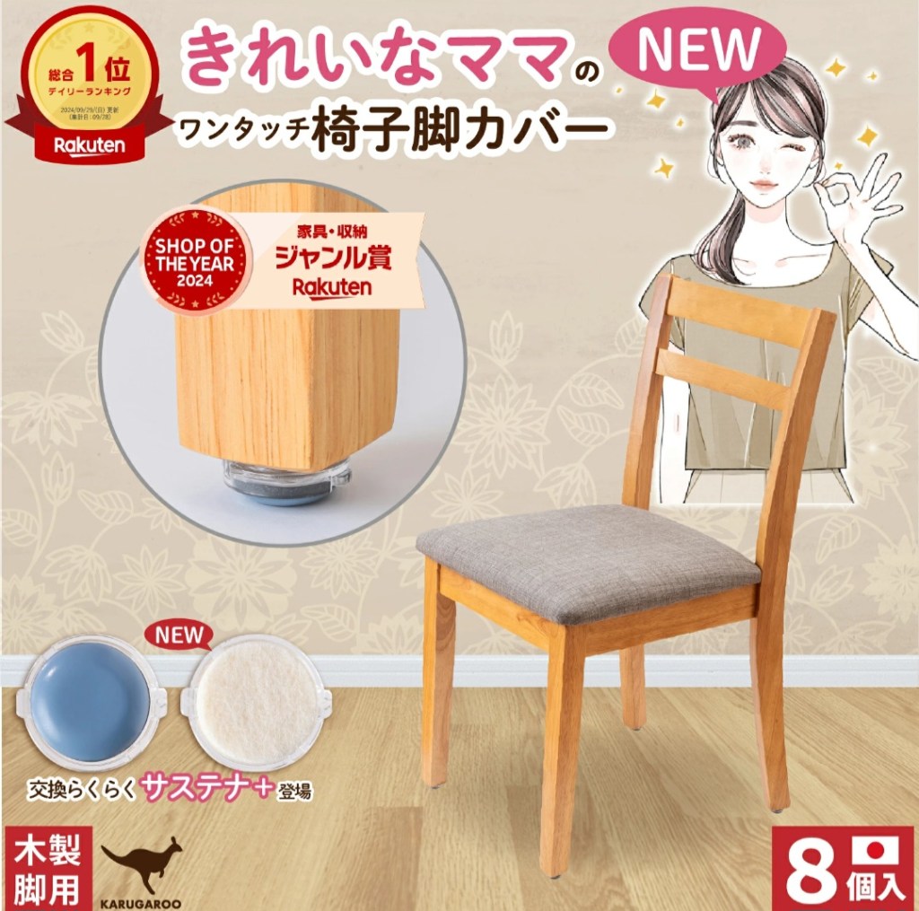 フローリングの傷防止や椅子の移動音軽減に役立つ「カルガルー 椅子脚カバー」。丸型・長方形・正方形などさまざまな脚にフィットし、フッ素樹脂加工で滑りやすく取れにくいのが特徴です。累計レビュー数も8,000件以上の人気アイテム!