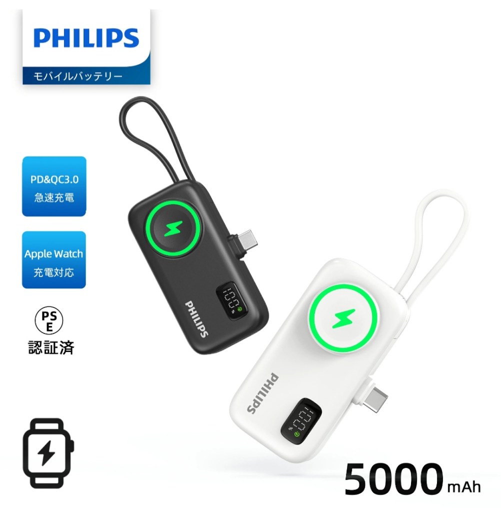 Philips(フィリップス) モバイルバッテリー 小型 Apple Watch対応 5000mAh(PD22.5W/USB-C内蔵/パススルー/LED)