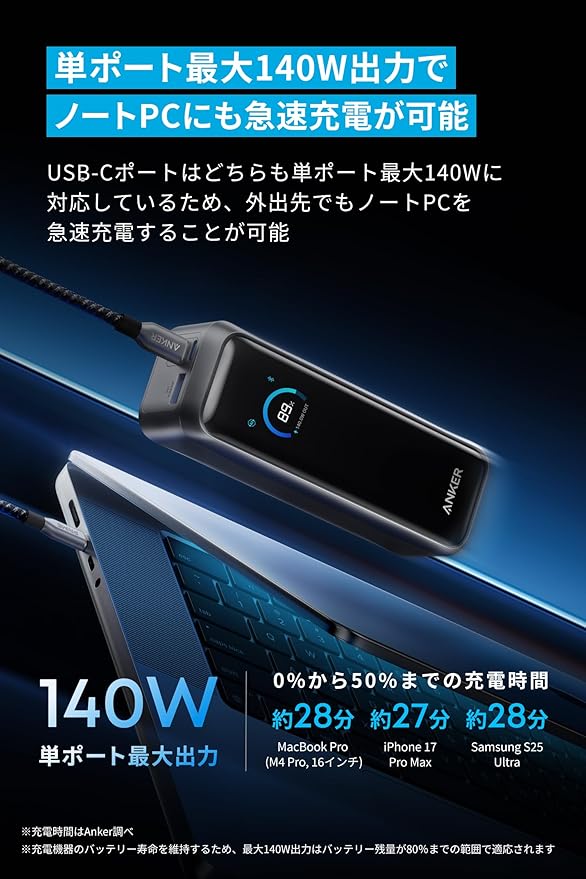 このモデルの一番の魅力はやはり「ノートPCをちゃんとモバイル運用できる出力」があること。 一般的なモバイルバッテリーだと45〜65W程度ですが、Anker Prime Power Bankは単ポート最大140W対応なので、 USB-C対応のノートPCならほぼフルスピードで充電できます⚡