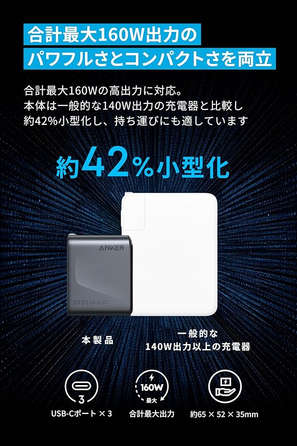 - 最大160Wの超高出力(USB-C×2 / USB-A×1)