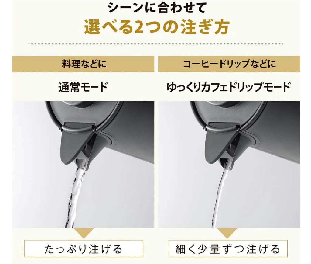 実際に使っていて便利だと感じたのが、注ぎの切替機能。 たっぷり注げる「通常モード」と、コーヒーのハンドドリップ向きの「ゆっくりモード」が選べるので、 シーンに合わせてお湯の量をコントロールしやすいです。