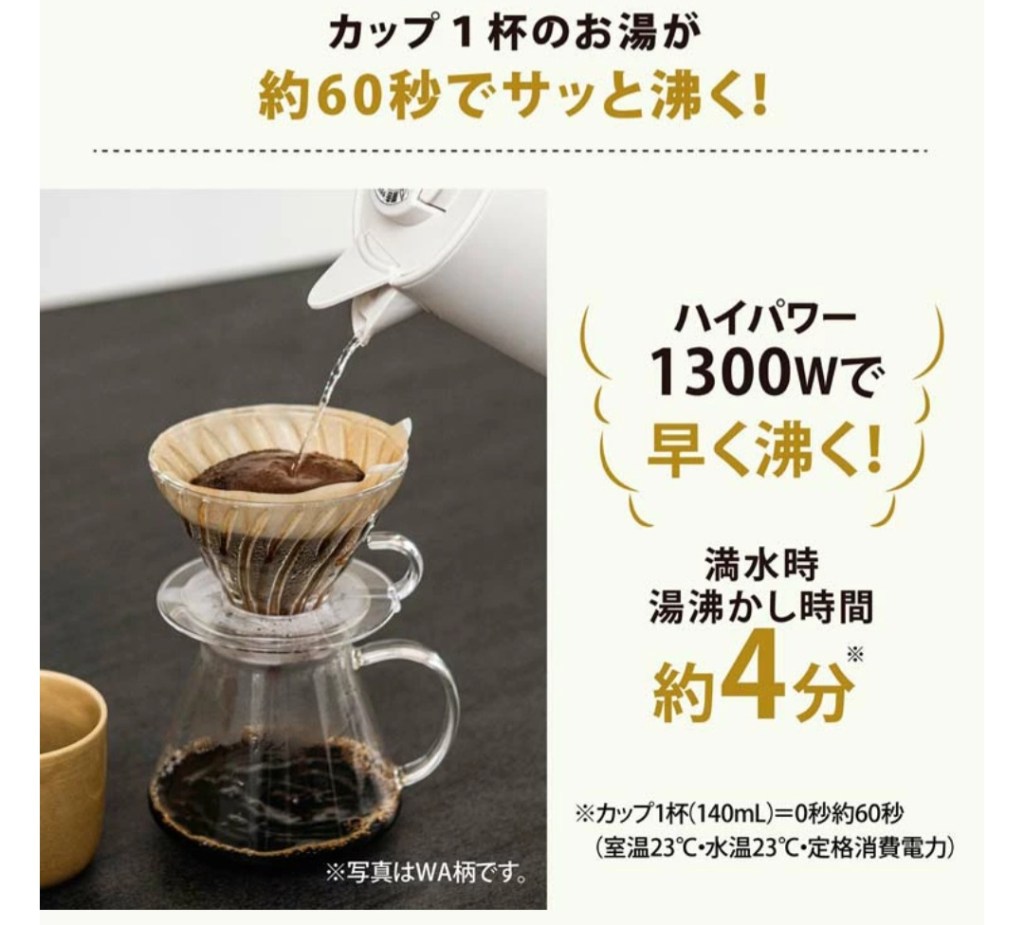 - 1300Wで沸くのが早く、忙しい朝でも待たされない