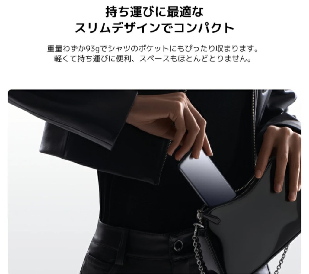 約93gの軽さと、胸ポケットにもスッと入る薄型ボディが特徴のモバイルバッテリーで、 「とりあえずカバンやポーチに1枚入れておく」感覚で持ち歩けるのが最大の魅力だと感じました。