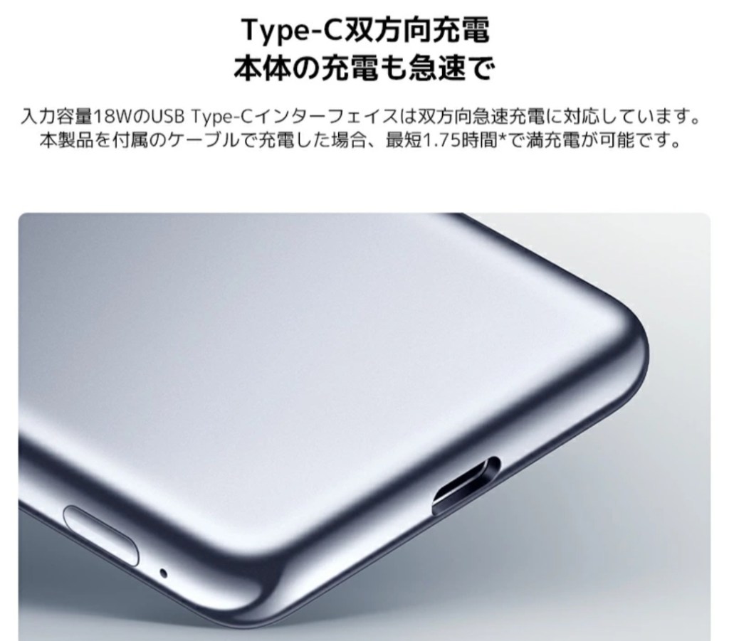- USB Type-C双方向充電対応で、本体もスマホも同じケーブルで済む