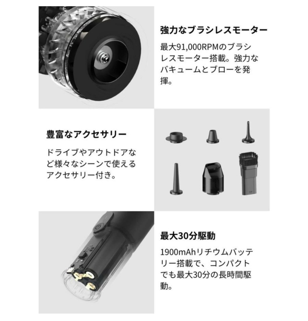 | 主な用途 | PC/デスク周り、車内、細部掃除、エア注入/排気(アウトドア系) |