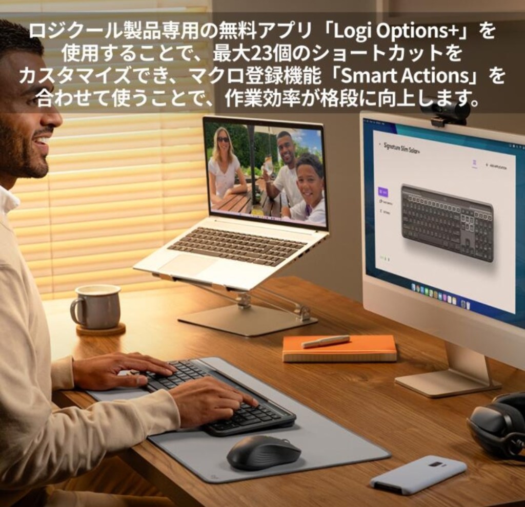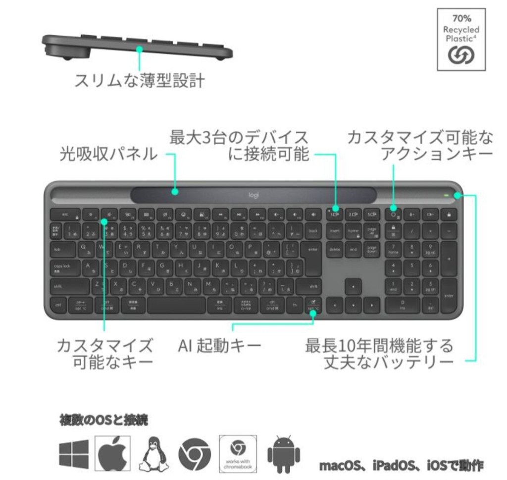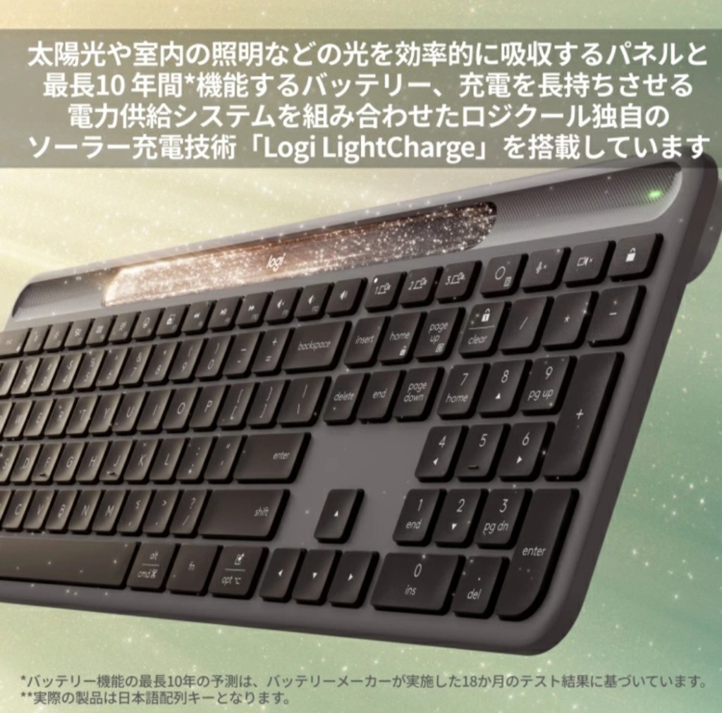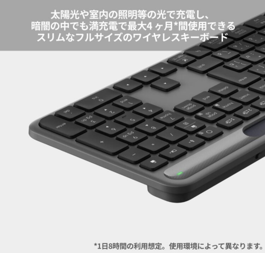 ソーラー充電で電池交換不要、Bluetooth / Logi Bolt対応で、Windows/Mac/Chrome/iPhone/iPadまで守備範囲が広いのが魅力です✨