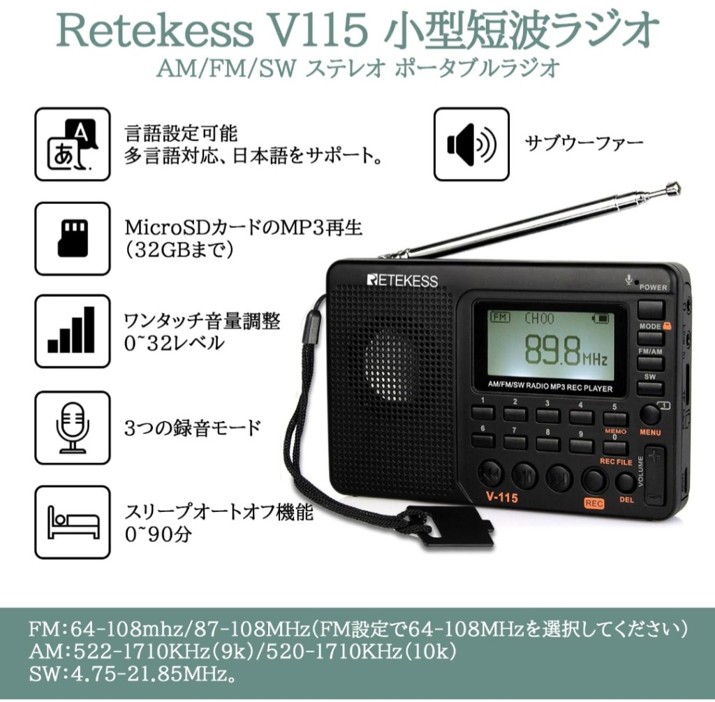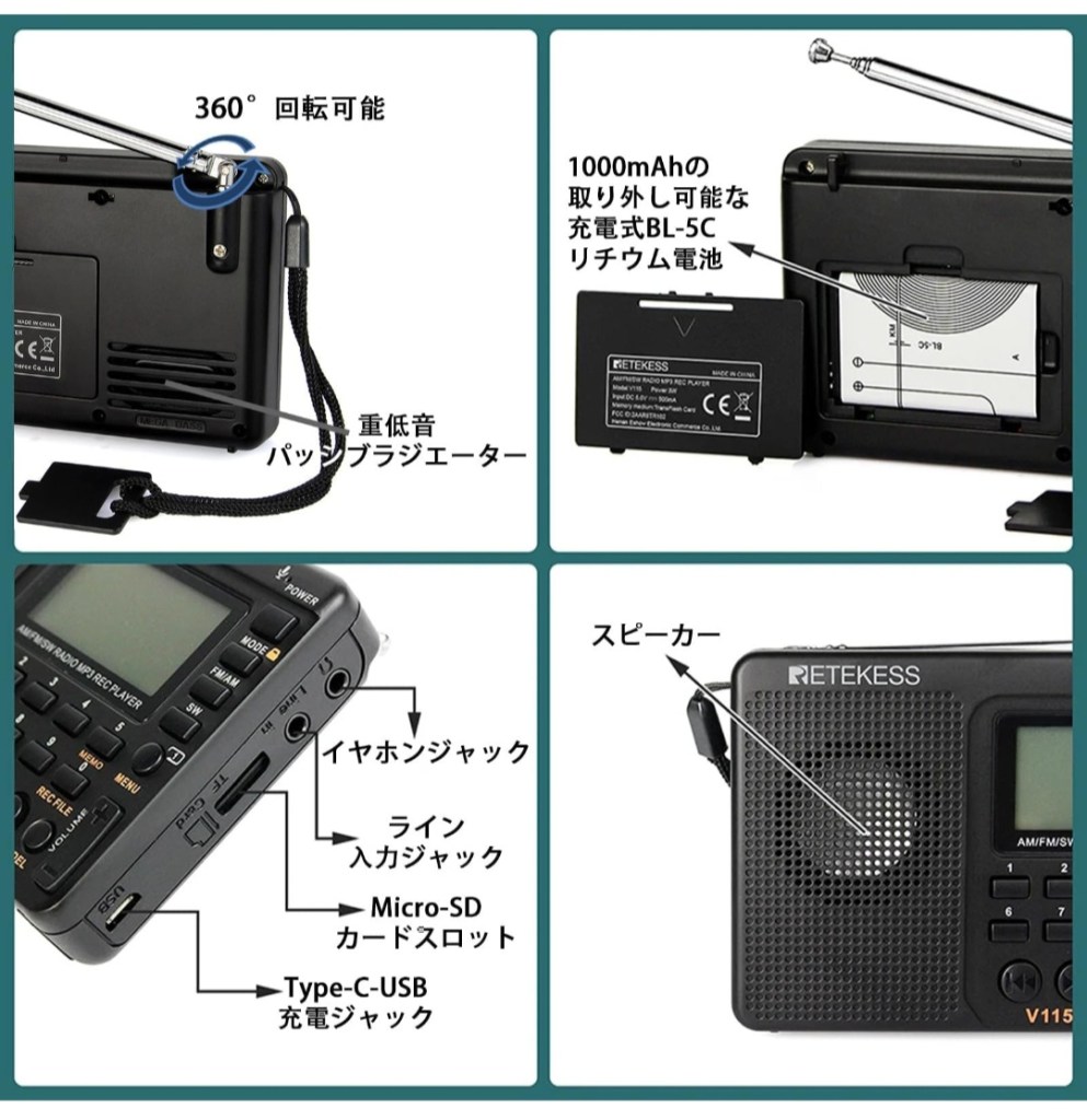 短波ラジオに興味はあったものの、「操作が難しそう」「音質が微妙そう」というイメージがあり、正直これまで手を出していませんでした。 そんな中、USB-C充電・日本語表示・録音対応という条件が揃っていたのが、このRetekess V115。 実際に使ってみると、想像以上に完成度が高く、防災用としても日常使いとしても安心できる1台でした。